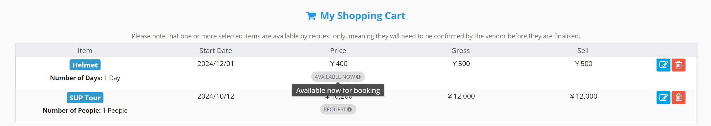 Your shopping cart will indicate which items are AVAILABLE NOW and which are REQUEST. You can make a confirmed booking for AVAILABLE NOW items, REQUEST items will require confirmation from the vendor.