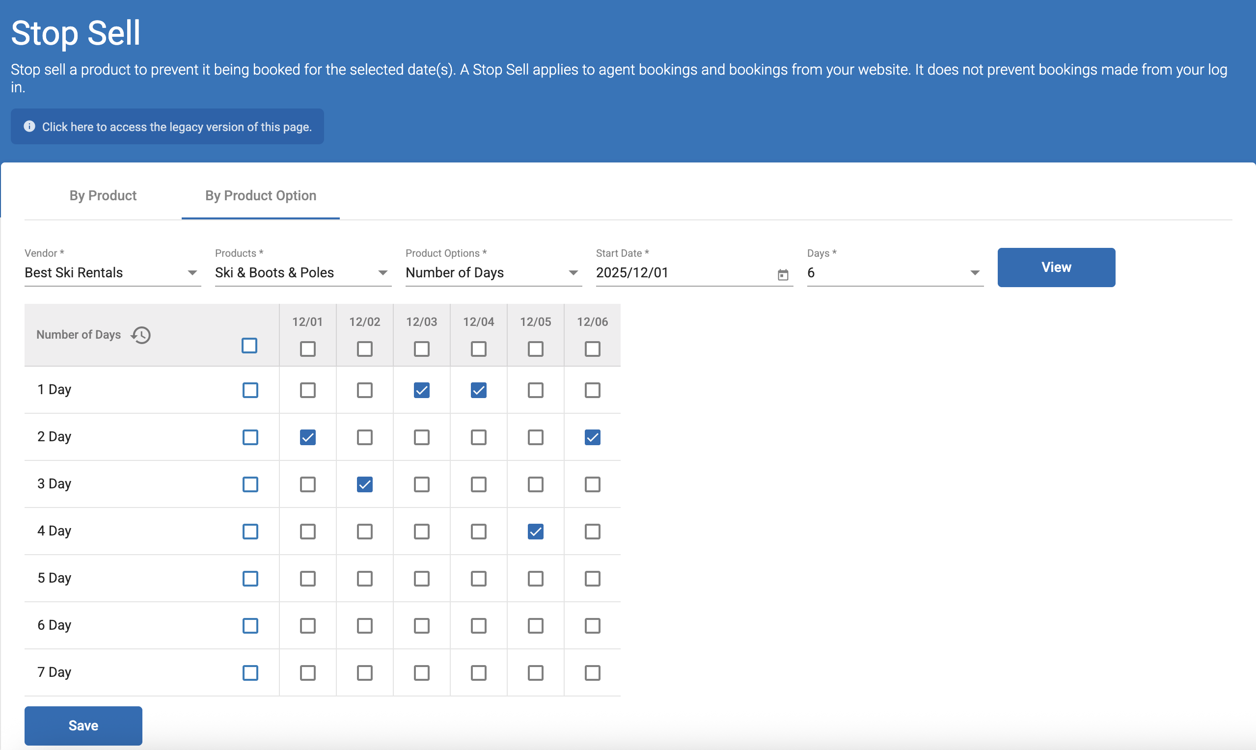 With the Stop Sells by Product Option setting, you can stop the sales of only selected product options, rather than suspending the entire product.
