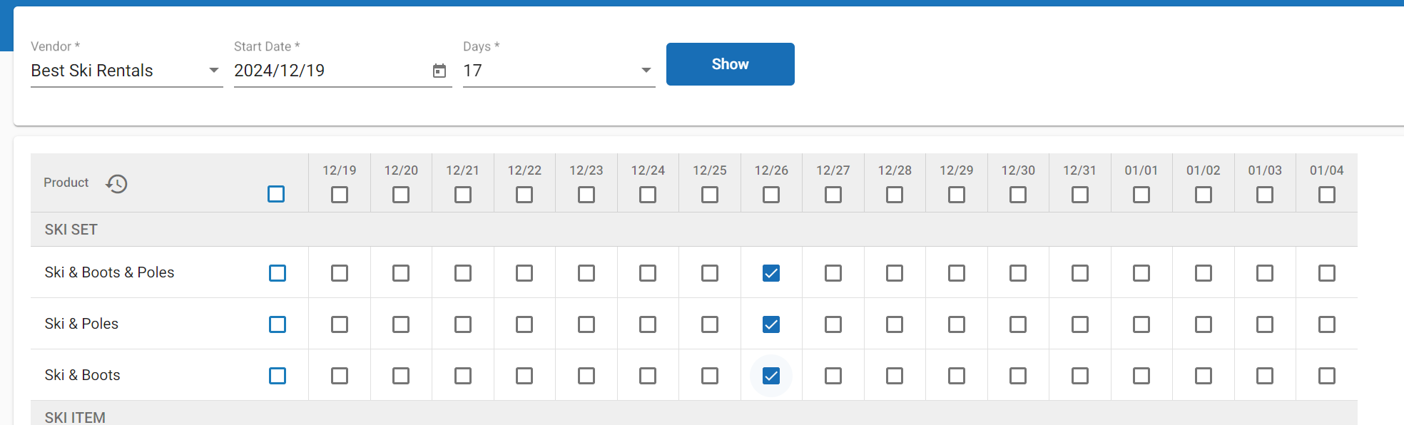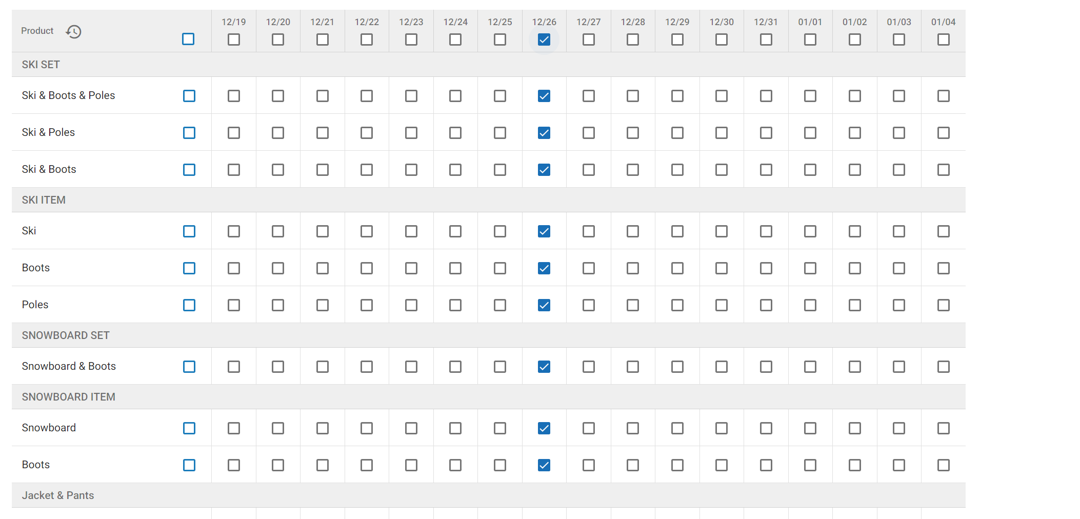 If a ski rental store was running out of ski availability for 26th a stop sell could be used to prevent any new booking for a product that uses skis on the 26th December.