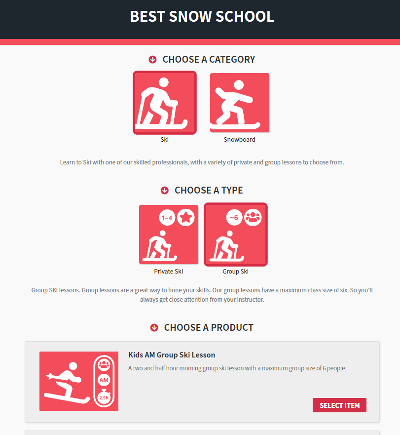 A simple ski school vendor setup would be presented to agents and direct customers as below, the hierarchy is fixed but the categories and products and defined by your setup: