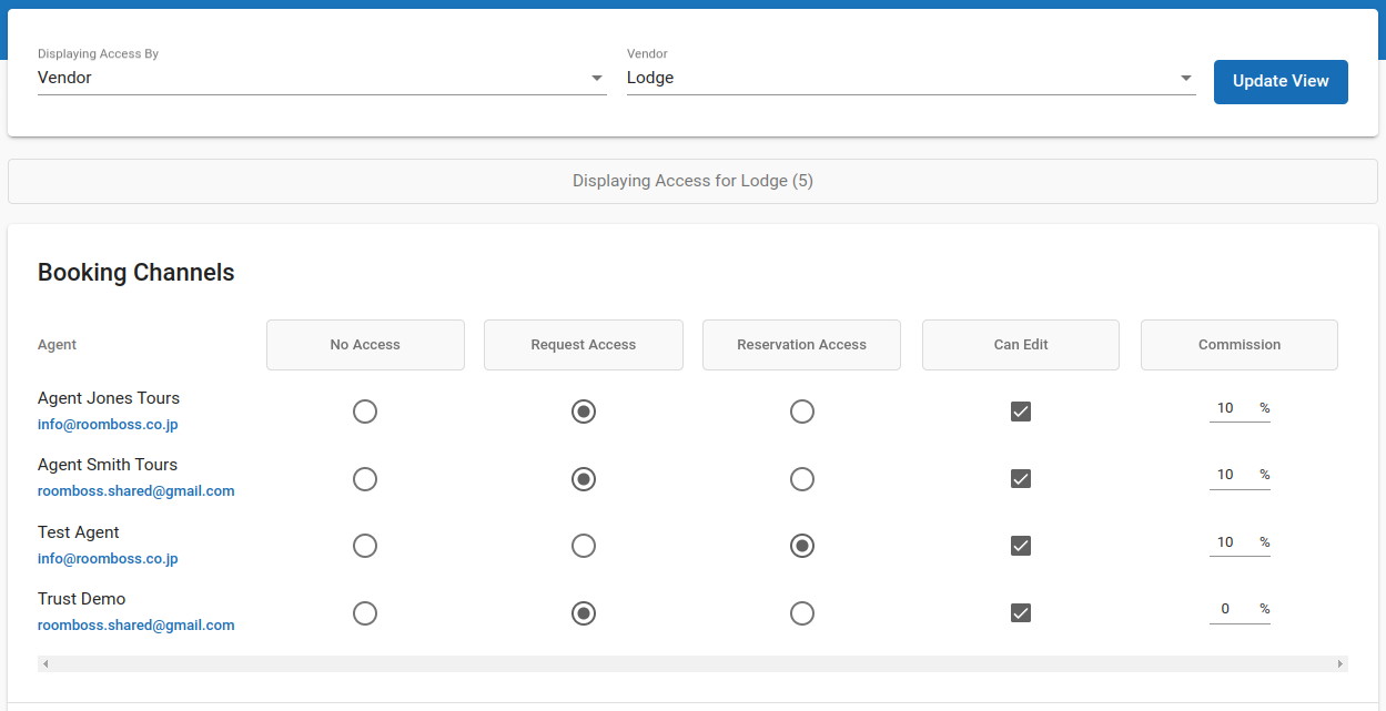 Agents need to be connected to your account. Please let us know if you would like to connect any agents. You can then grant access to them in order for the agents to make bookings. For each vendor in your account, access and commission are set on a per-agent basis: