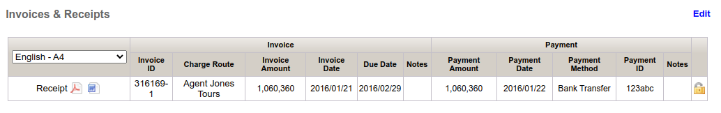 Following receipt of payment you may wish to send a Booking Confirmation PDF and/or Receipt PDF . This can be done by clicking the PDF icon on the left of the Booking Details section (for confirmations) or the PDF icon on the left of the Financials section (for receipts). Save this to your computer and email to the customer.