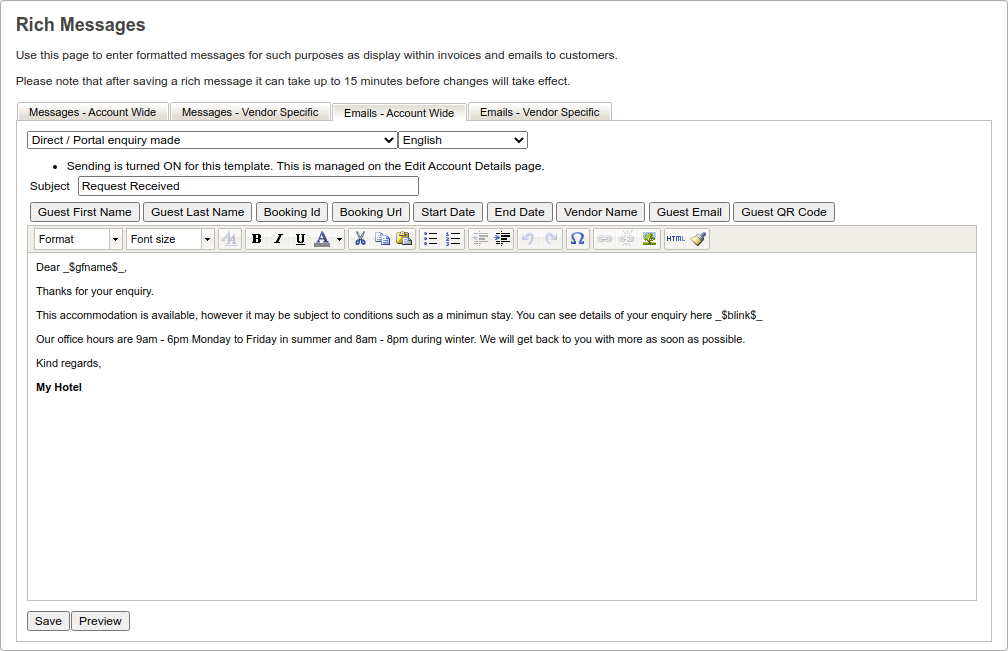 Emails sent using the template in the screenshot below would include the guest first name (replacing _$gfname$_) and a link to the guest booking (replacing _$blink$_).