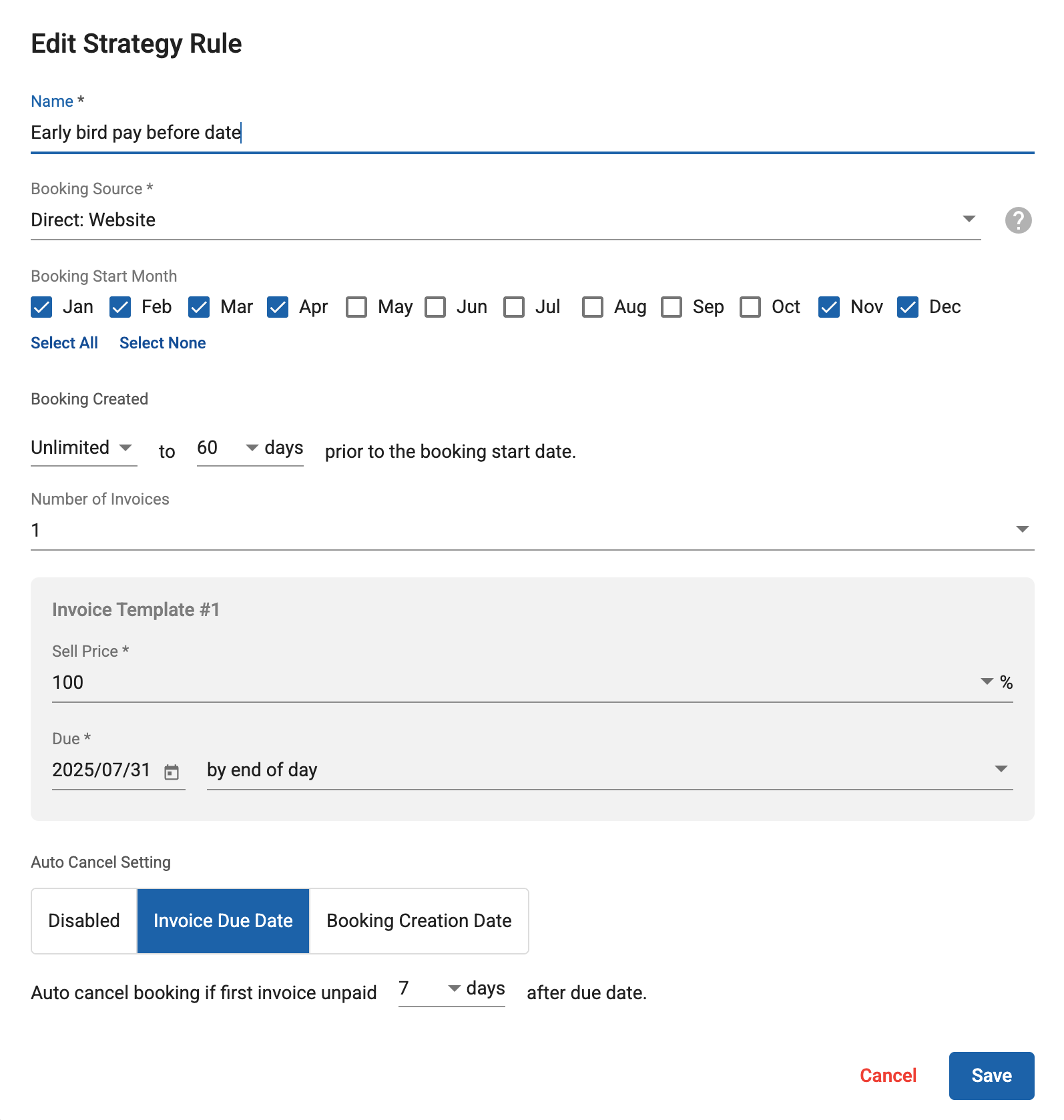 Now for all booking made under this invoice strategy, the payment due date all always be on 2025/07/31. If it is not paid 7 days after the due date, it will be automatically cancelled.
