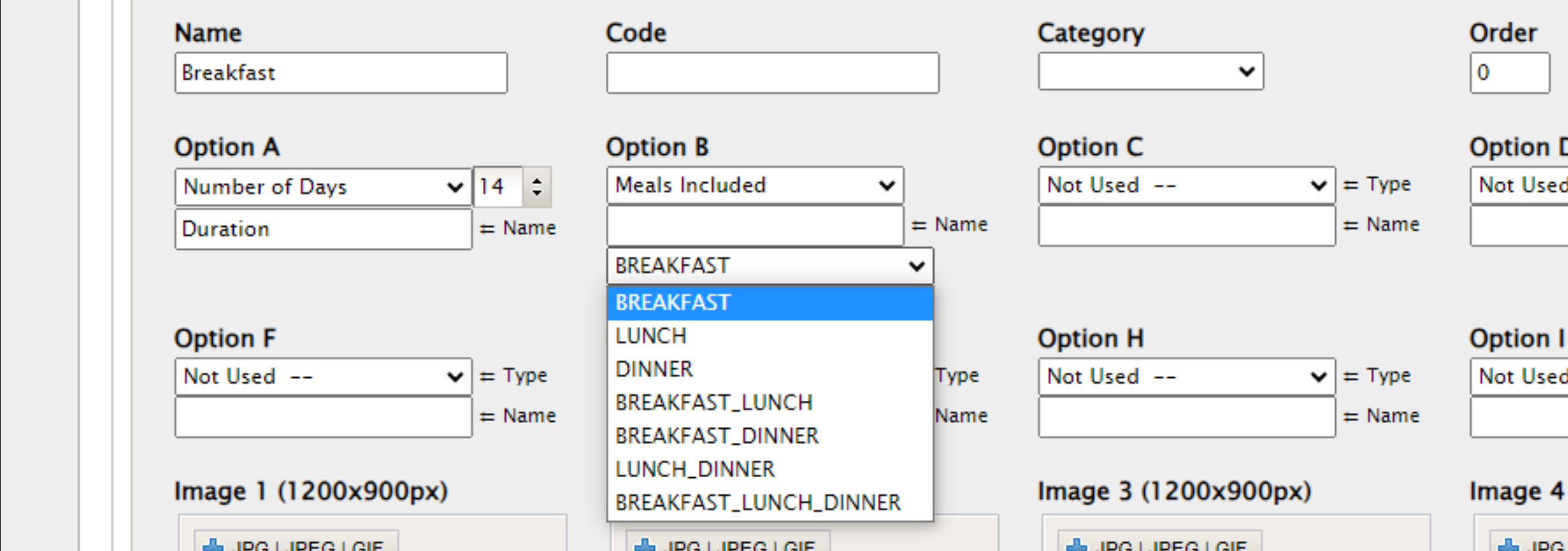 It is important not to add meals options to a product that has existing bookings. Adding or modifying meals options for products that have existing bookings can lead to invalid values on existing bookings.