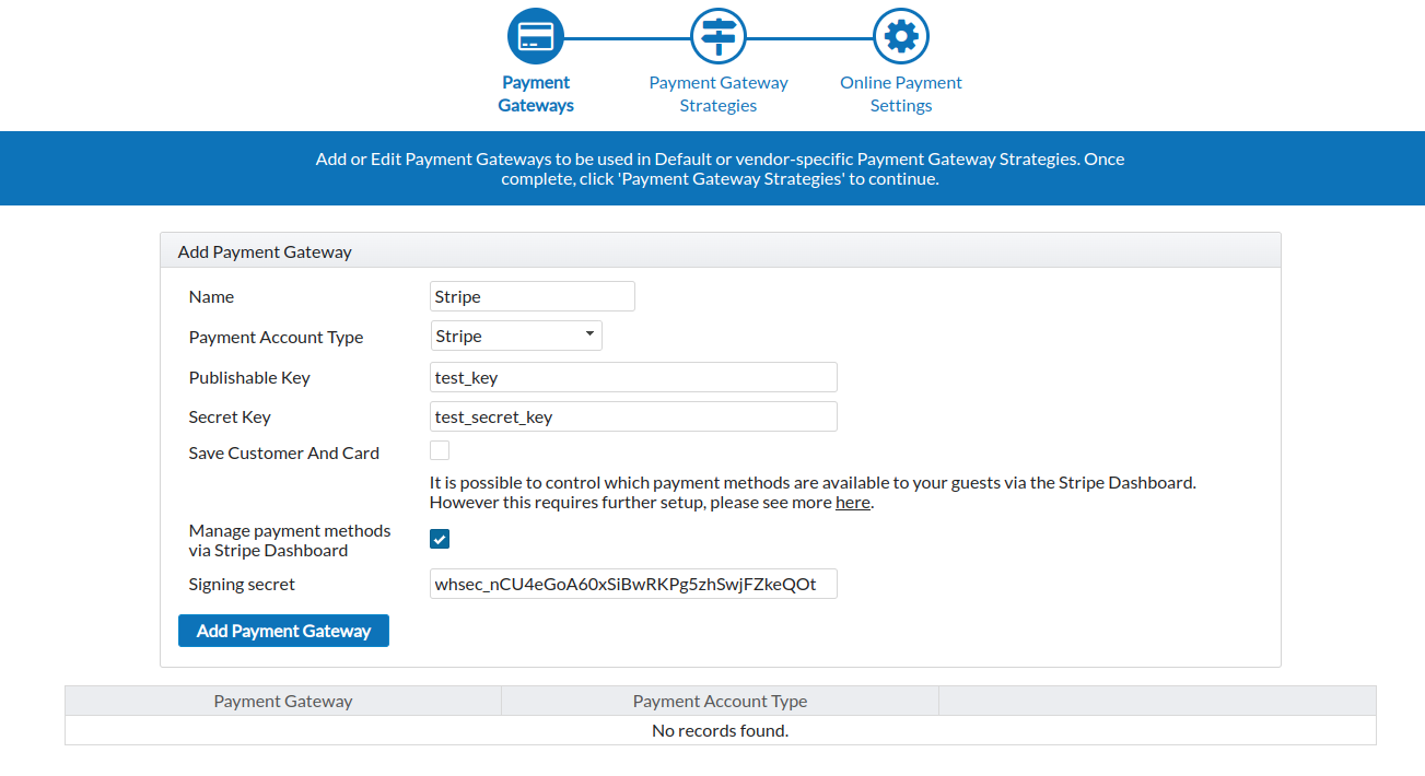 Publishable Keyand yourSecret Key. Watch this quick video guide for instructions on how to obtain these Keys: https://theorderguys.com/stripe-api-keys/ - Go to Online Payment Settings page within RoomBoss. Check "Enable payments method from Dashboard" and paste the Signing Secret and both Keys that you have obtained earlier.