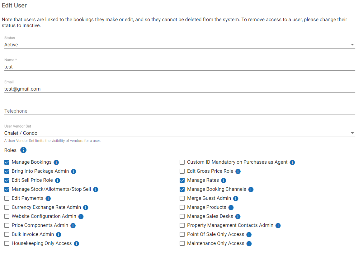 Users cannot be deleted as they are linked to the bookings they make or edit. To remove access from a user, simply change the Status of the account to Inactive.