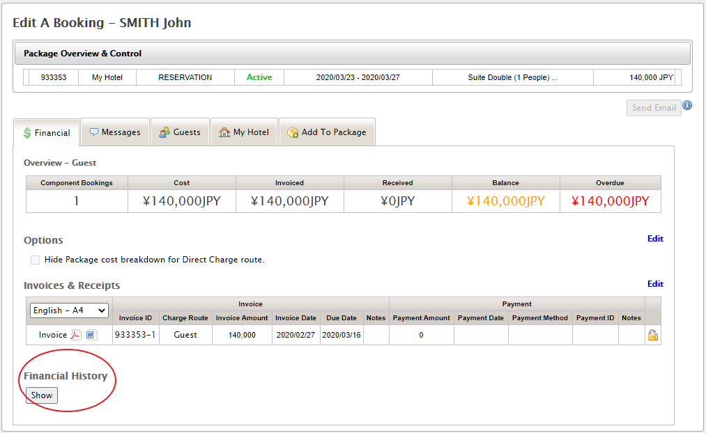 The Financial History is available to view on the Financial tab of Edit A Booking page and includes: