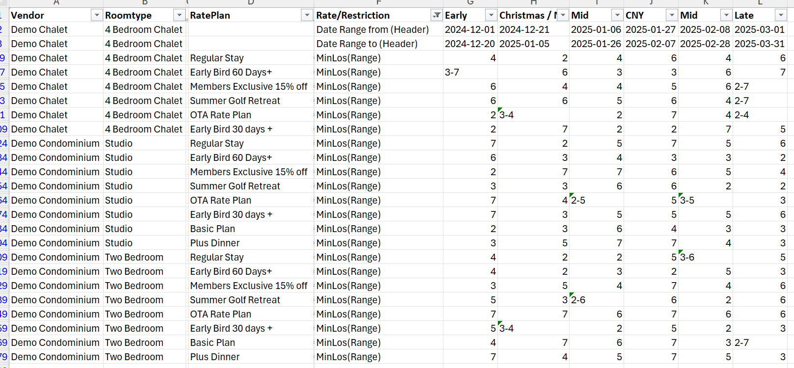 Filtering column F for MinLos(Range) and Date Range from (Header) and Date Range to (Header) would give the base for all periods, for all Rate Plans across all Room Types in the report: