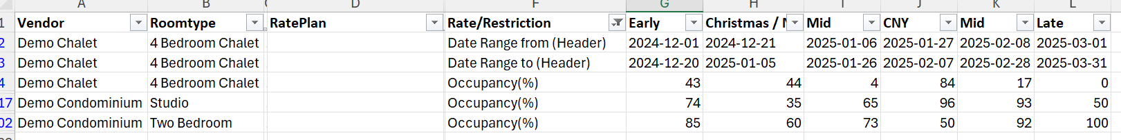 Filtering column F for Occupancy% and for rates containing (Base) and Date Range from (Header) and Date Range to (Header) would give the base for all periods, for all Rate Plans across all Room Types in the report:
