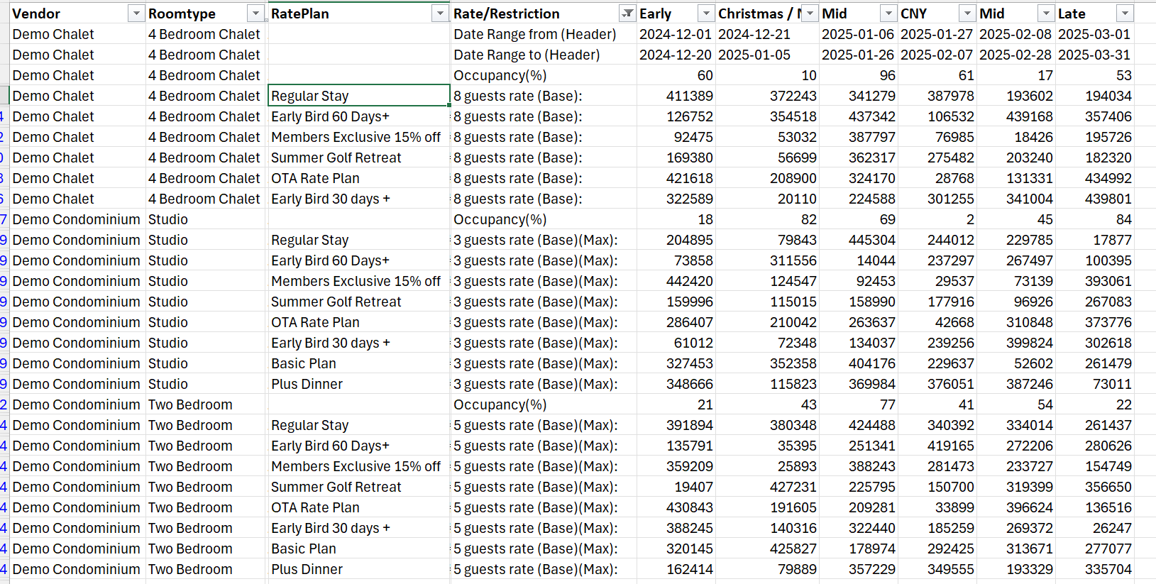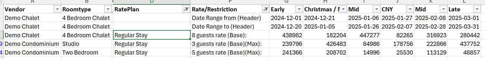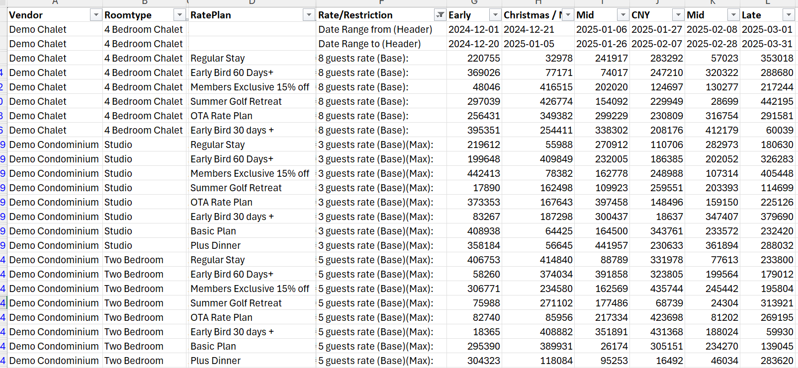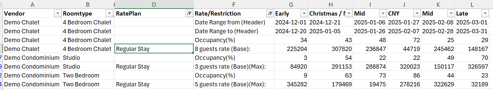 Filtering column F for rates containing (Base) and Date Range from (Header) and Date Range to (Header) and column D for a specific Rate Plan (and blank values )would give the base for all periods, for this Rate Plan across all Room Types in the report:
