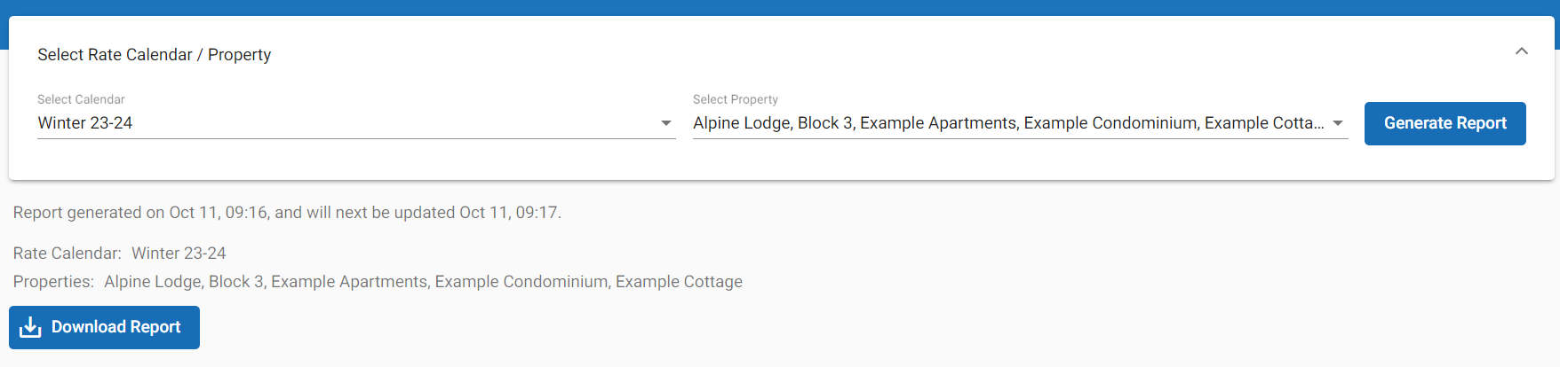 To run the report choose a calendar, properties and Generate Report.