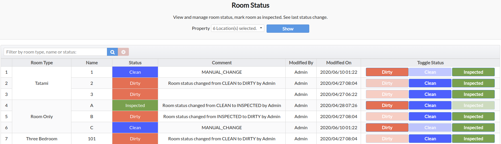 Each room has a status that indicates the cleanliness of the room, the statuses are Dirty, Clean and Inspected.