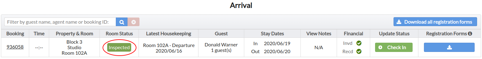 The Arrival page on Front Desk HQ displays the Room Status for incoming arrivals. Allowing the Front Desk team to confirm if a room is available for check in. This can be used if a guest arrives earlier than the designated check in time.