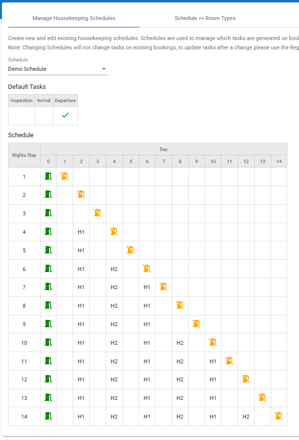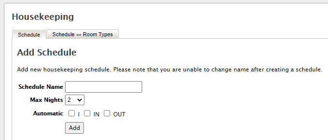Prior to using housekeeping it is necessary to setup events and schedules, then associate schedules with room types.