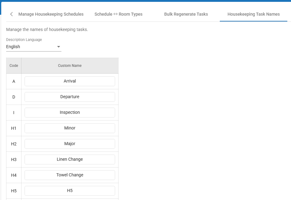 To edit the name of a cleaning event - Custom Name, navigate to the Housekeeping Task Names tab, select the language, enter the custom name, and click Save at the bottom of the screen.