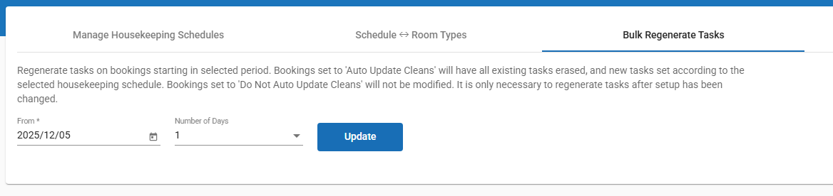 If a booking’s Housekeeping Update Setting is set to "Auto Update Cleans", the modified tasks will be regenerated through this bulk update.