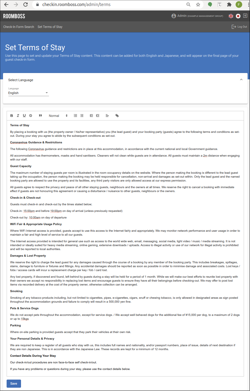 - Navigate to the Terms of Stay page - https://checkin.roomboss.com/admin/terms
