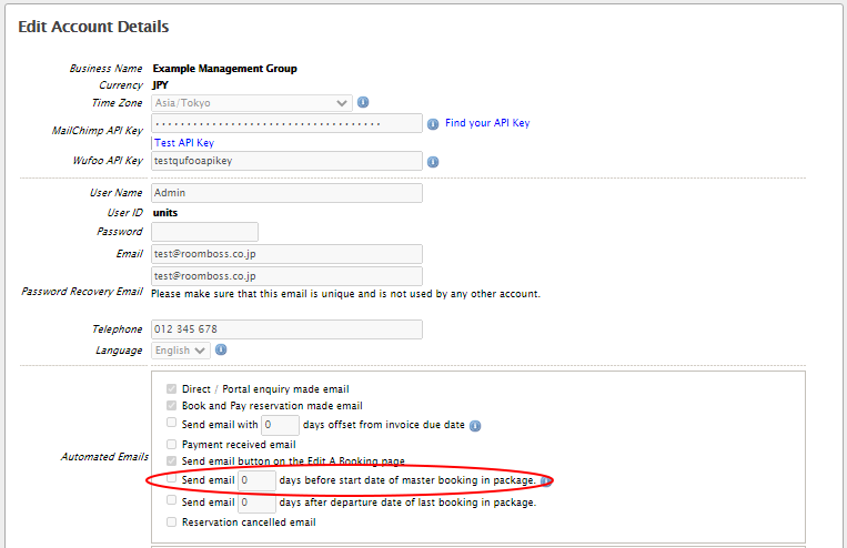 - Click the checkbox next to Send email x days before start date of master booking in package
