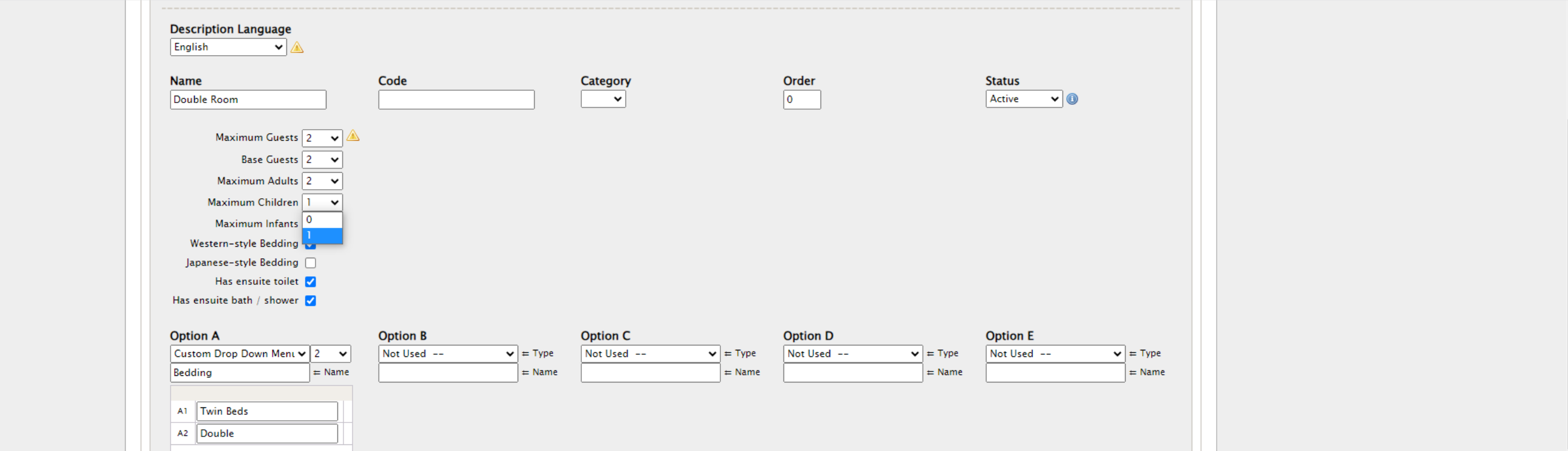 Then, set the maximum number of adults, children, infants on the Product Details → Room Type page for each product as seen in the example below.