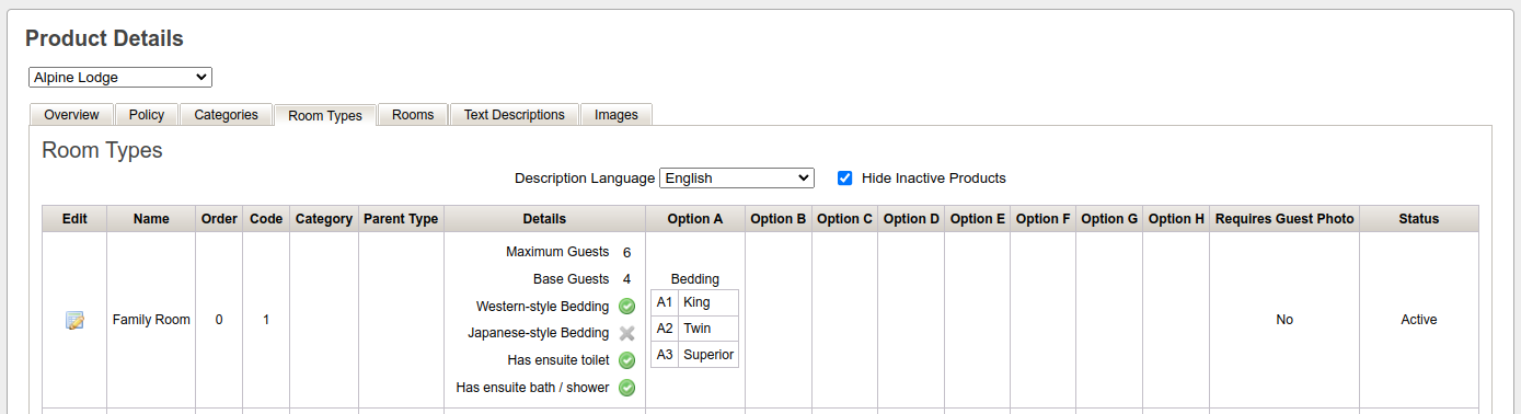 Under the Room Types tab, details about the room(s) can be set and updated.
