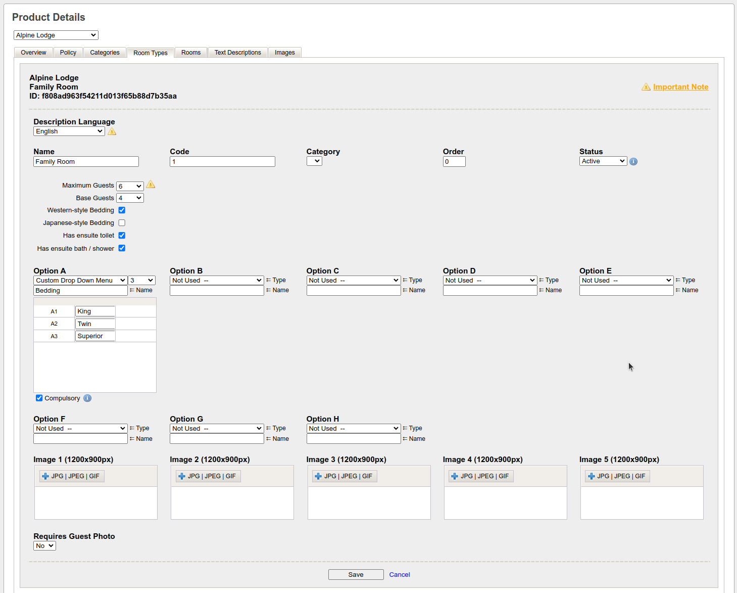 - Upload images for this room type. They are visible to potential guests within the Accommodation booking widget and will be displayed when viewing this specific Room Type