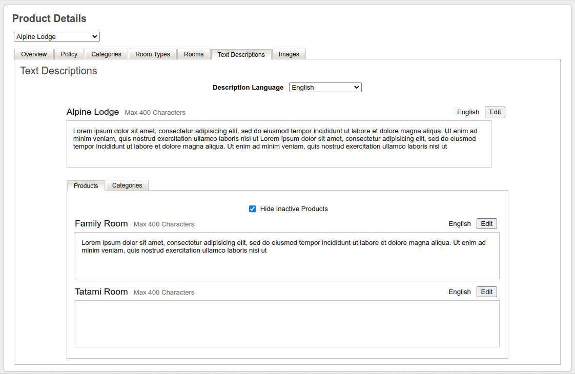 Room details and options can be entered in several languages. Currently supported are, English, Japanese, Chinese (simplified or traditional), French and Korean. If you enter several languages here products and options will be displayed to users in the language they choose.
