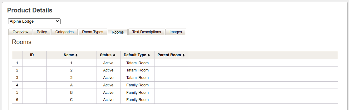 This tab will show you the Name, Status and Room Type (Default Type) of each of the rooms in your Accommodation.