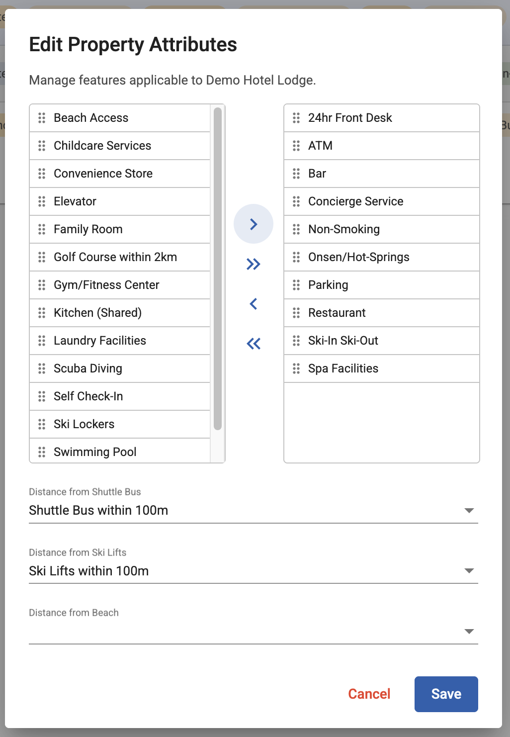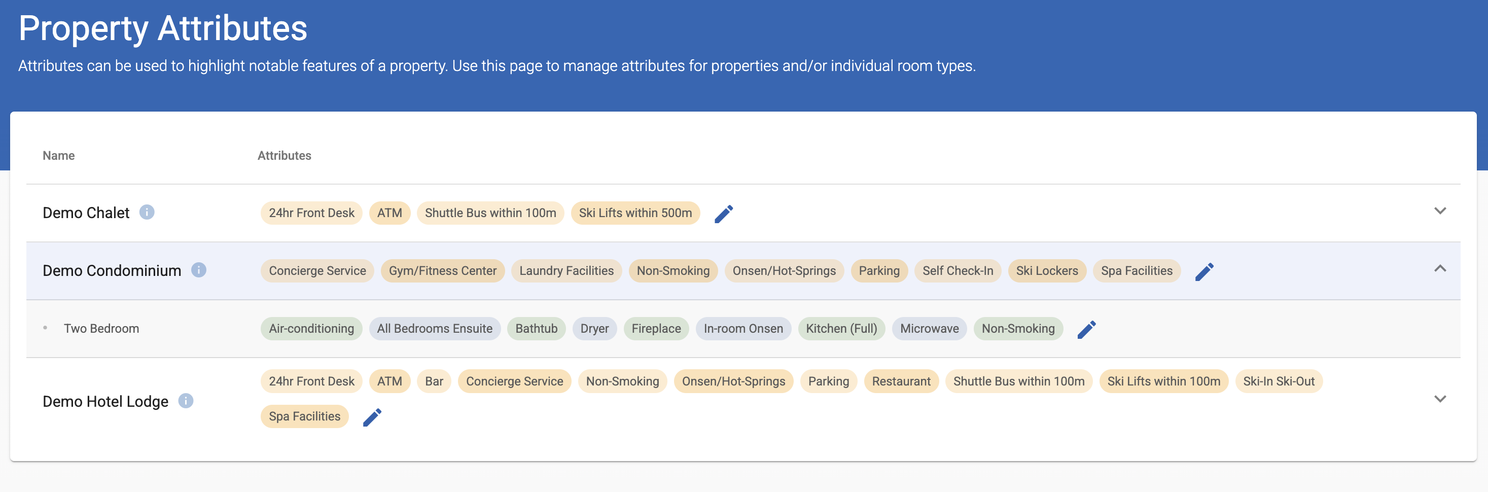 The Property Attributes page allows you to assign key features such as Onsen/Hot-Spring, Ski-in Ski-Out, or Parking to accommodation properties and room types.