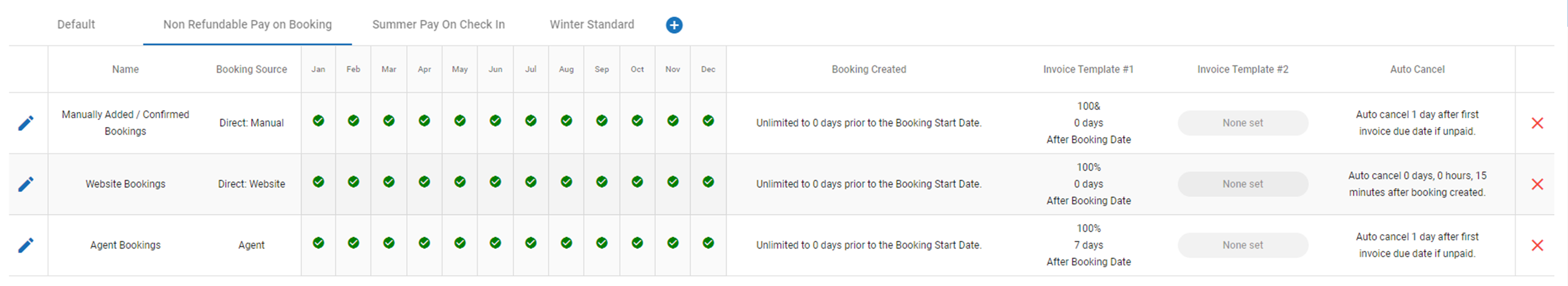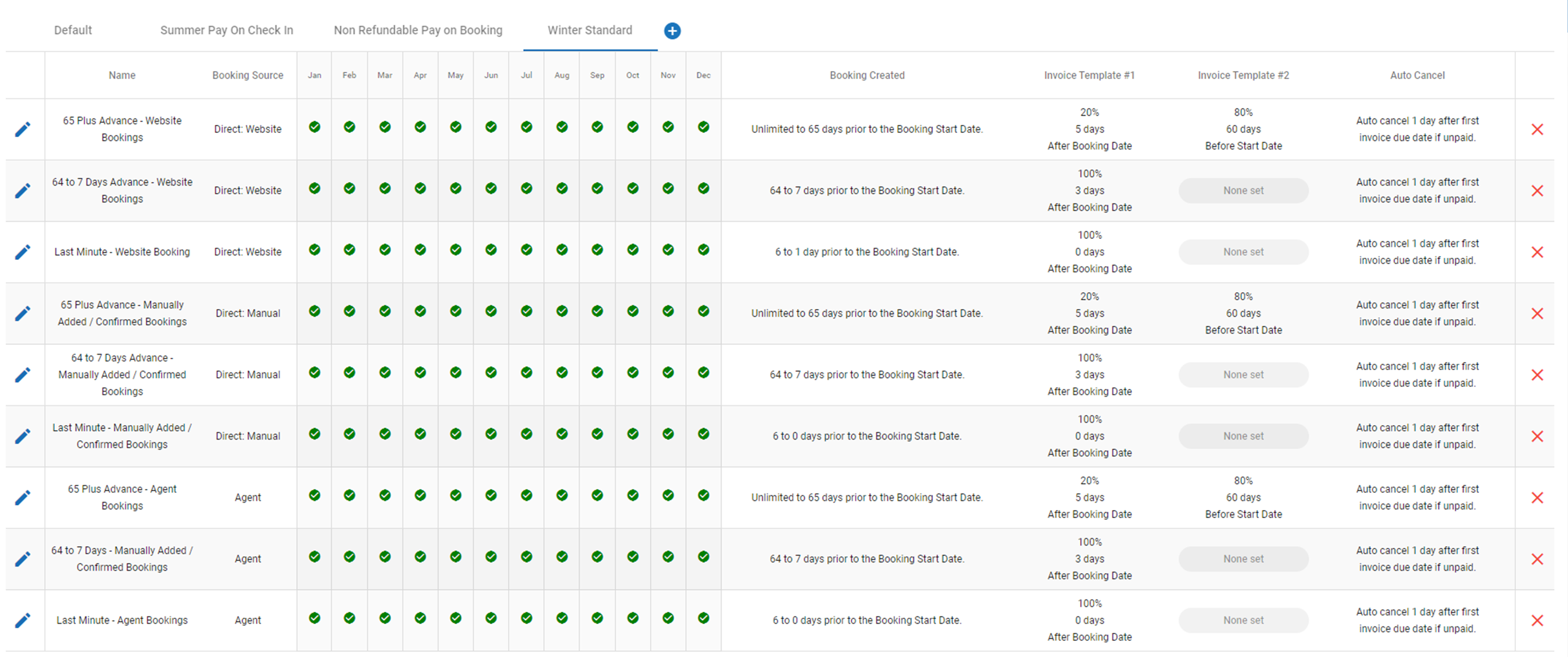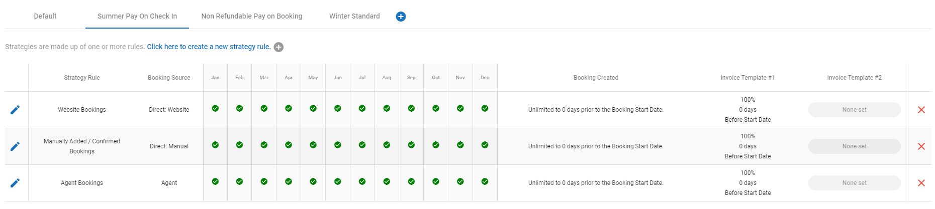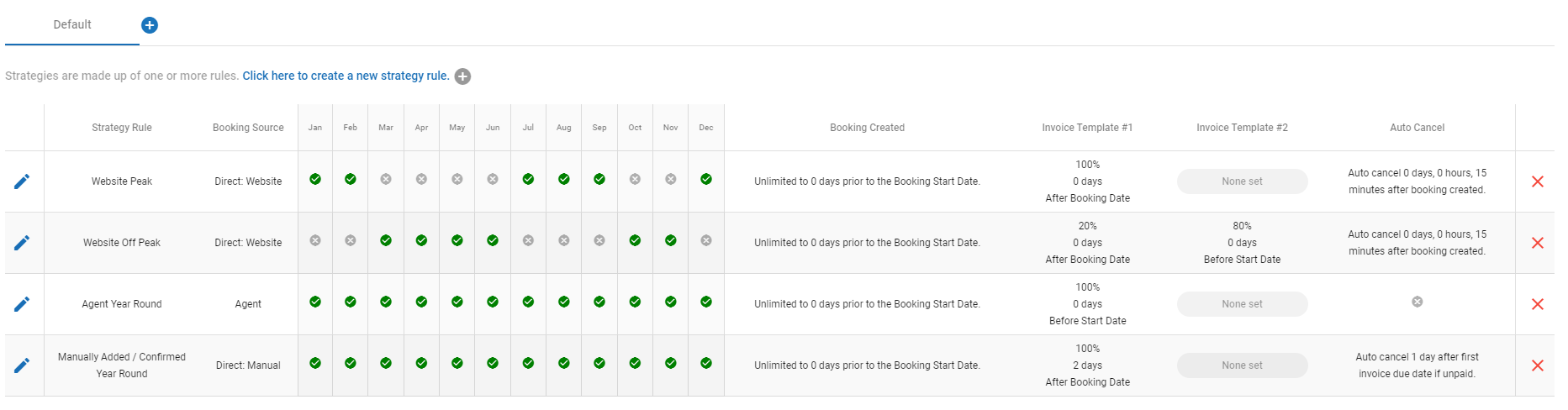 An example setup using the account default strategy for Agent, Direct and Website bookings with different policies for Peak (Jan, Feb, Jul, Aug, Sep, Dec) / Off Peak check ins for website bookings.