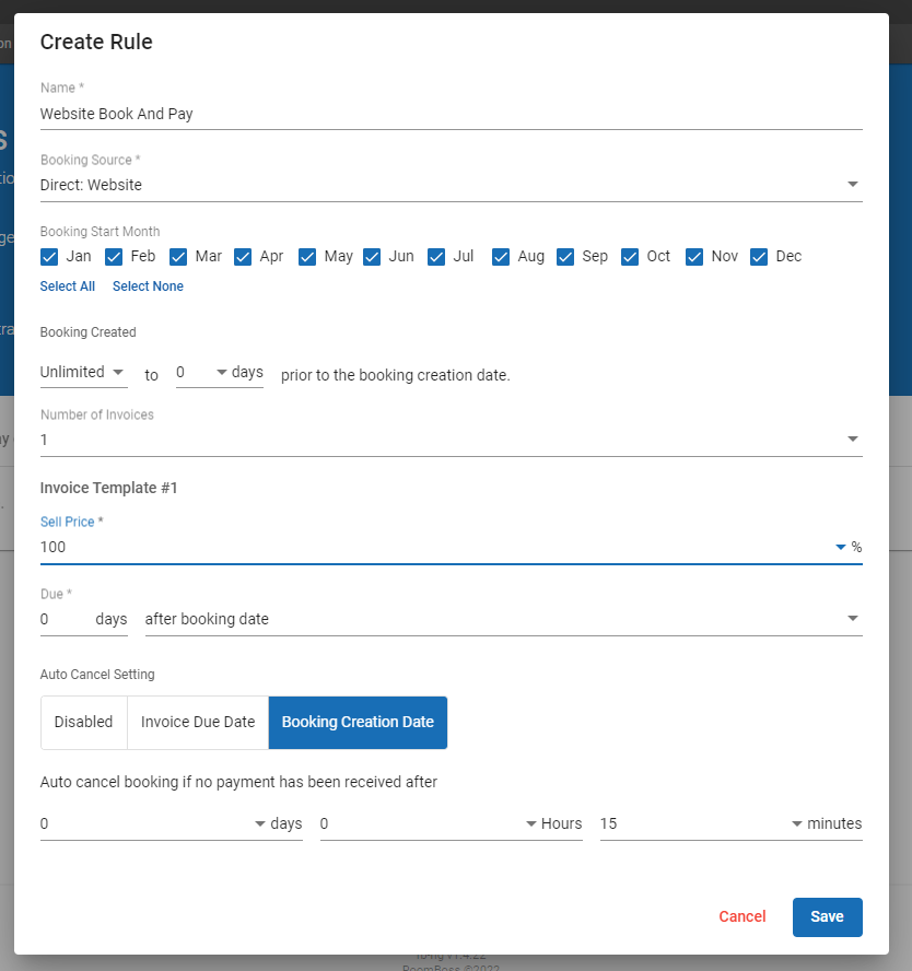 No invoices or auto cancels will be set for bookings that do not match these settings.