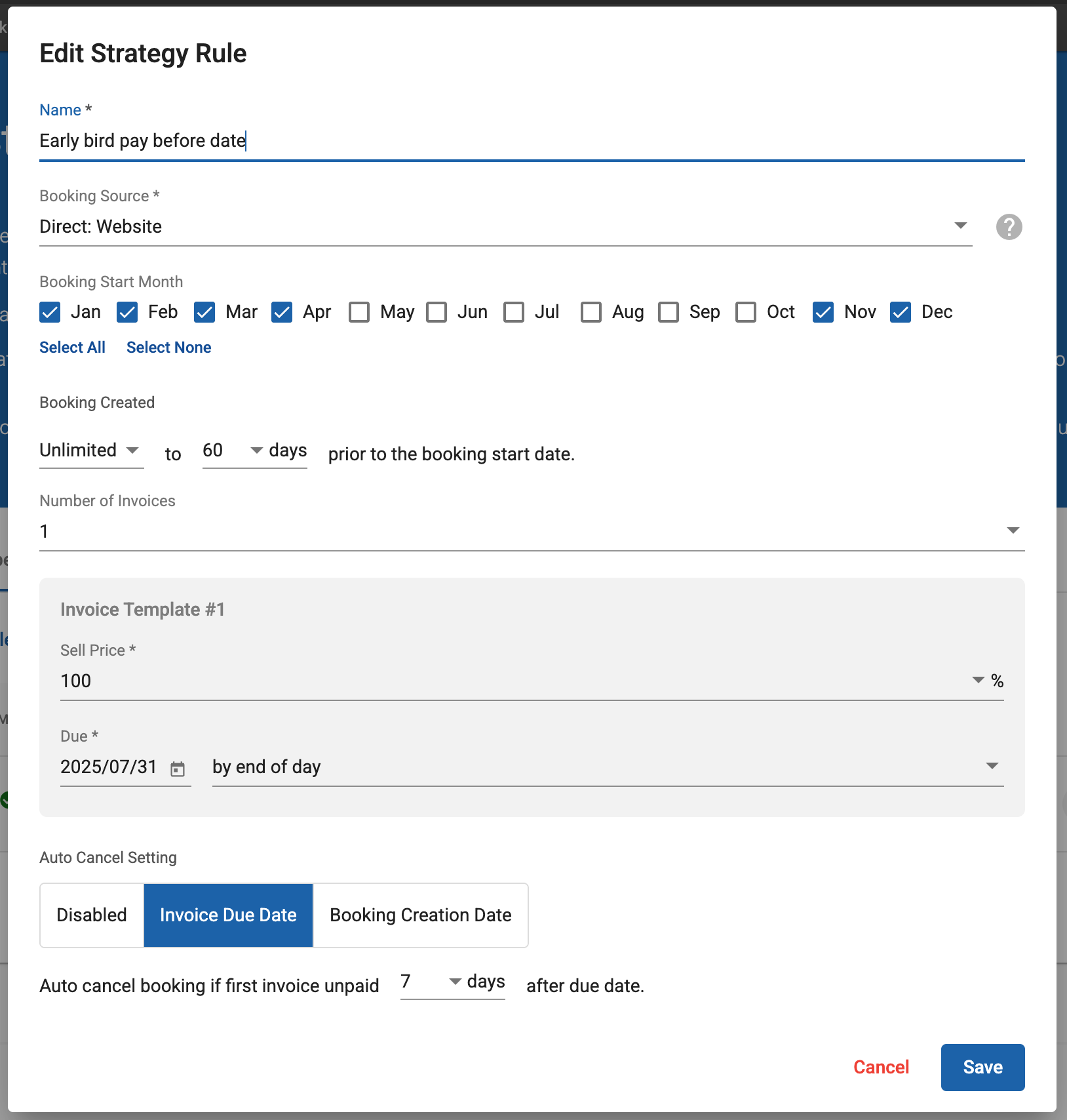 Now for all booking made under this invoice strategy, the payment due date all always be on 2025/07/31. If it is not paid 7 days after the due date, it will be automatically cancelled.