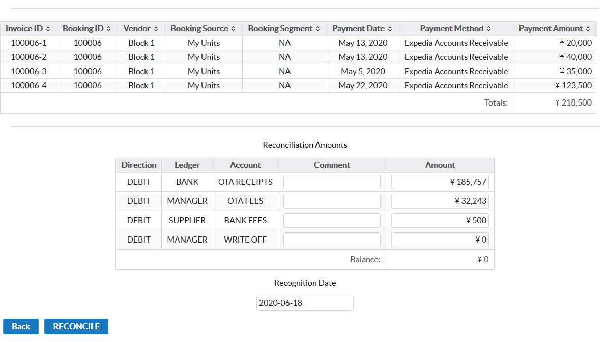 All Accounts Receivable payments that have not yet been reconciled will show on this page. In the above image we have set the filter by payment method to Expedia Accounts Receivable showing us 4 payments for a total of 218,500 JPY. Using the checkbox we can choose the payments we want to reconcile and click next.