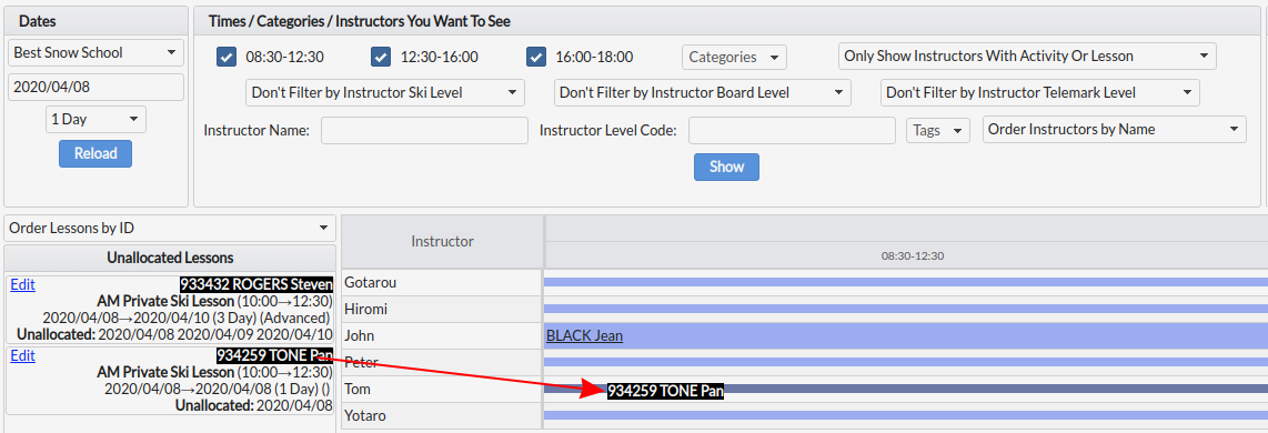 If your ski school utilizes RFID check-in, guests can be allocated to instructors during on-mountain check-in as well. Please see the On Mountain Check In And Lesson Allocation With RFID section for more info.