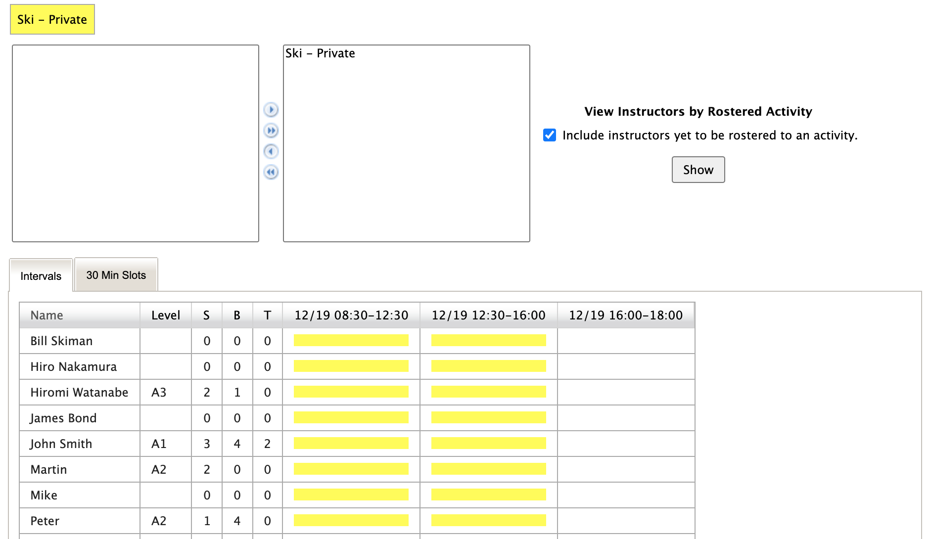 Clicking the Show Allocation Table link will bring up a view of your instructors over the date(s) of the lesson. You can filter down to instructors scheduled for a particular activity to assist in identifying candidates for the lesson.