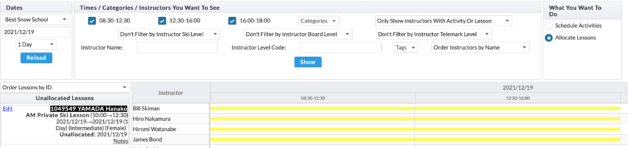 Drag Unallocated Lessons displayed on the left to instructors (see below).