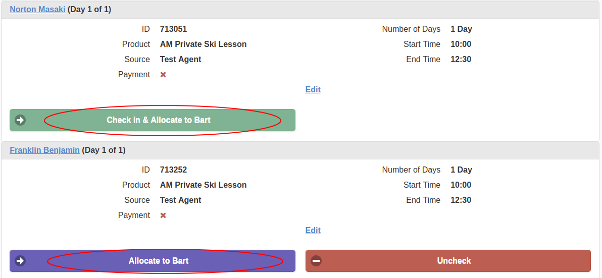 - Click the Allocate to [Instructor Name] button to allocate the lesson to a guest who has already checked in