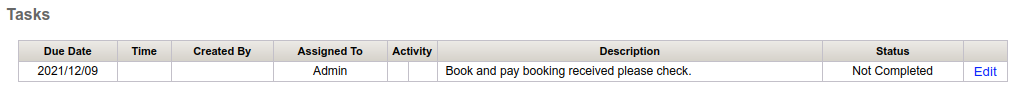 Tasks are added to bookings on the Edit A Booking page, and are primarily used for sales purposes, i.e. chase up a sales lead, taking payment reminders and payment chases.