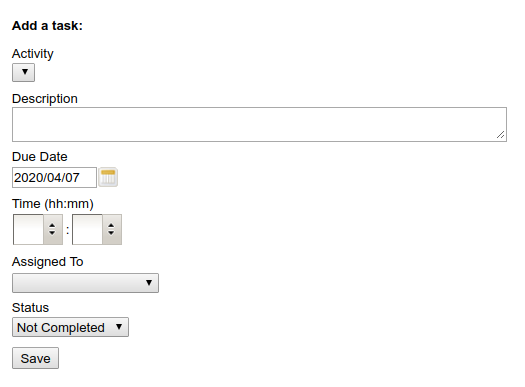 A searchable list of all tasks is available by clicking on the Tasks link on the home page or by navigating to CRM → Tasks