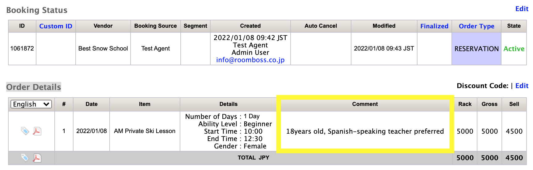 - Click the Edit button of Order Details on Edit A Booking page and add the comment to the comment column.