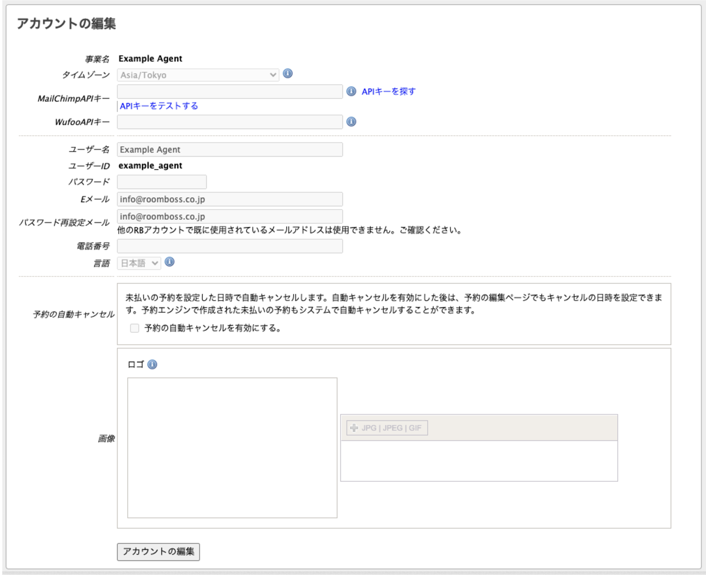 このページでは、ユーザー名、パスワード、メールアドレス、電話番号、RoomBossからの連絡に使用される言語の設定ができます。