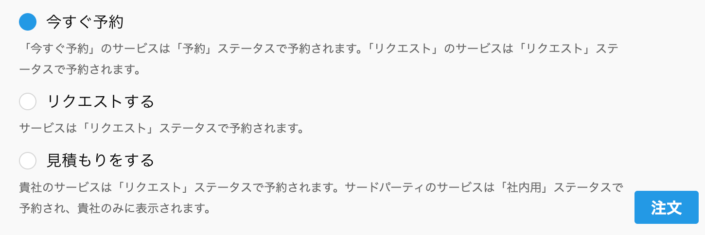 RoomBossには「社内用」「リクエスト」「予約」の、3つの異なる「注文タイプ」があります。