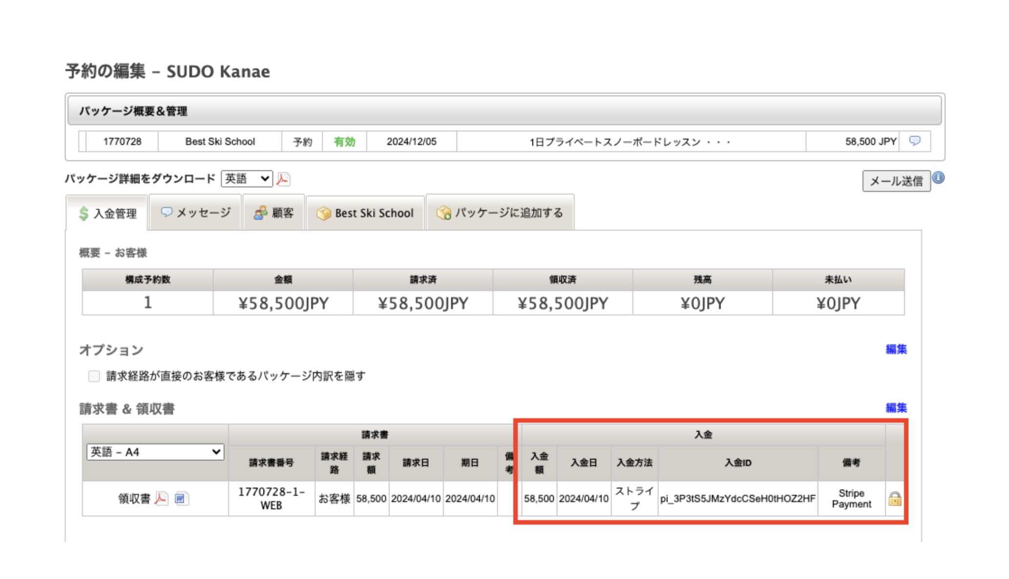 - お支払いいただいたかの確認は、予約編集ページの「入金管理」タブより確認することができます。