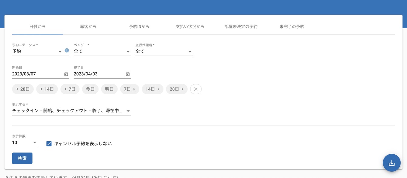 - チェックイン・開始、チェックアウト・終了、滞在中の予約(選択した期間に含まれる全ての予約が表示されます)