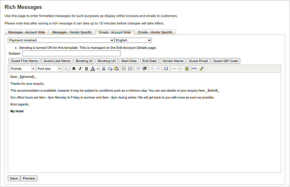 - 件名を入力 - メールの送信時に、RoomBossは件名に予約IDを追加します