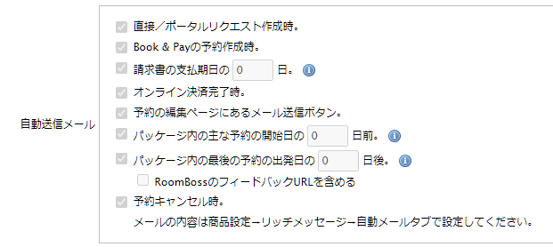 自動送信メールのボックスの中で希望の配信タイミングのチェックボックスを選択チェックが入っているイベントにEメールが送信されます。