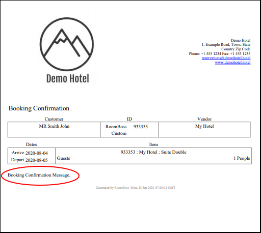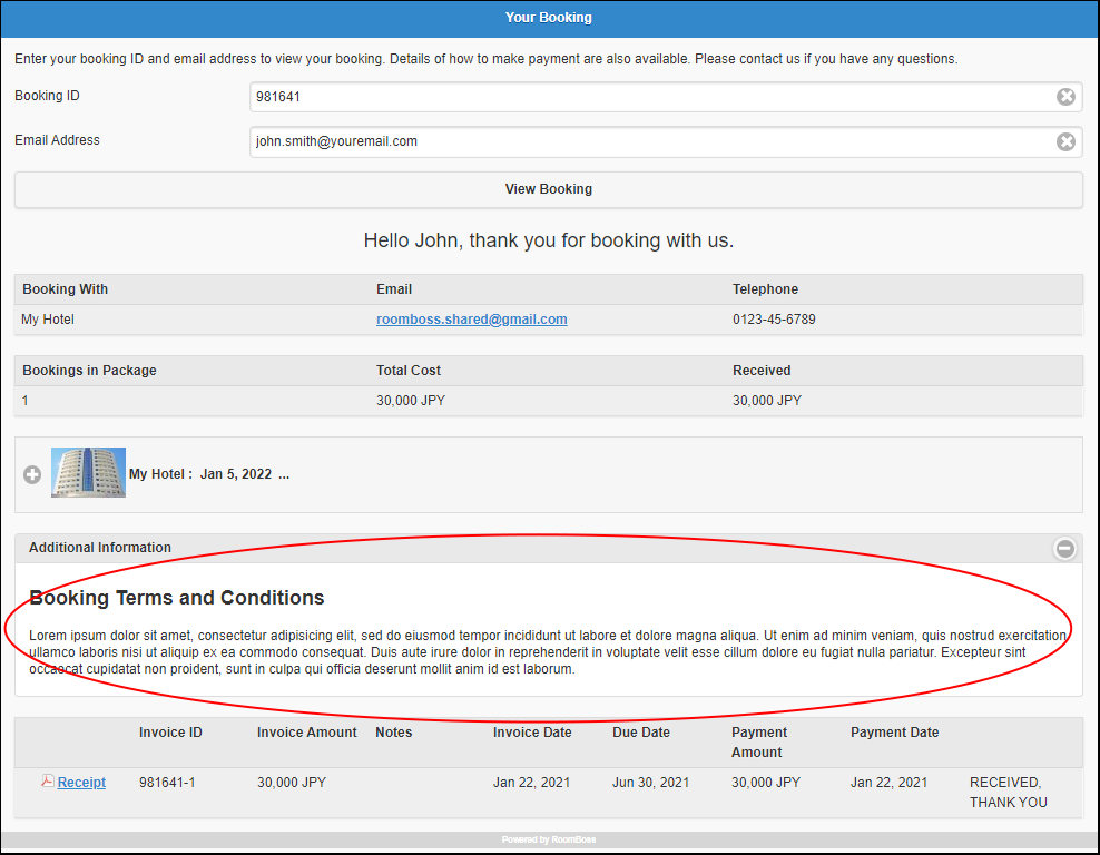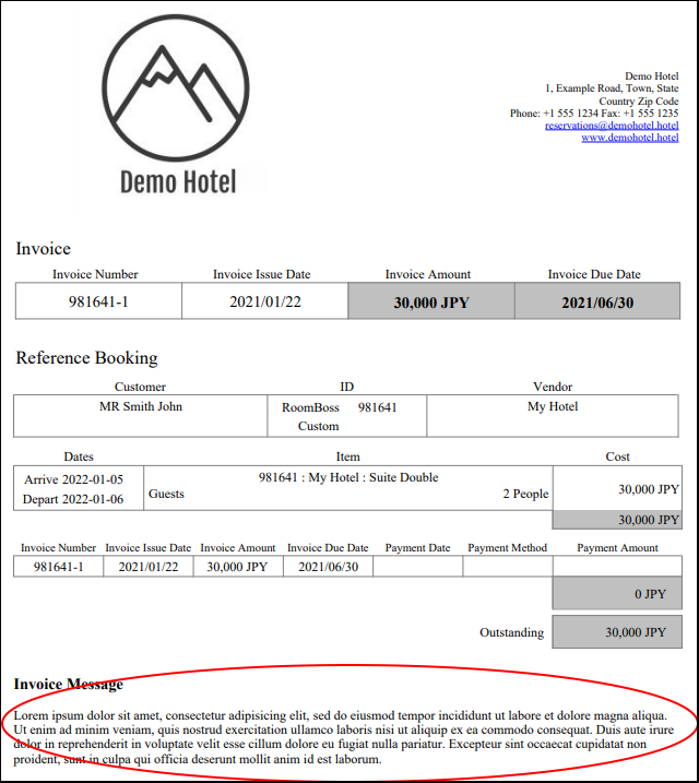 ここで入力された情報は、予約確認書のほか、顧客イントラネットのメッセージやRoomBossの予約編集ページの入金管理タブからダウンロードできる請求書にも表示されます。