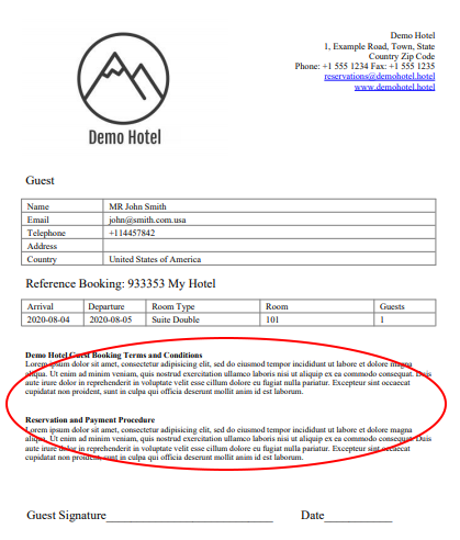 これにより、フロントデスク概要がチェックイン時に使用するレジストレーションカードに、利用規約や地図、その他の便利で重要な情報などのコンテンツを追加してカスタマイズすることができます。