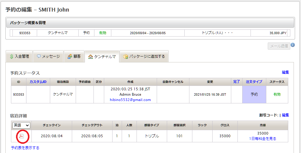 ここで入力した情報はRoomBoss内の予約の編集ページでダウンロードできる予約確定書PDFに表示されます。