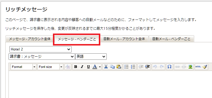 このメッセージ機能では利用規約、銀行口座詳細、その他案内などをベンダーごとに表示させることができます。